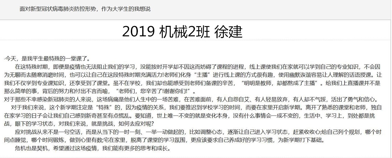 此次线上学风建设活动创新了工作方法,不仅展现了机电学院学子积极向上的精神风貌,同时引导了同学们时刻牢记当代大学生的使命与担当,以学战疫,为打赢疫情防控阻击战凝聚青春力量。