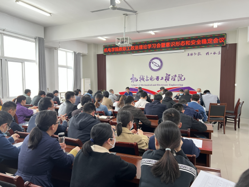 4月20日下午,机电学院在工科C楼三楼会议室召开教职工政治理论学习会暨意识形态和安全稳定工作会议,机电学院全体教职工参加,会议由党委书记杨杰主持。