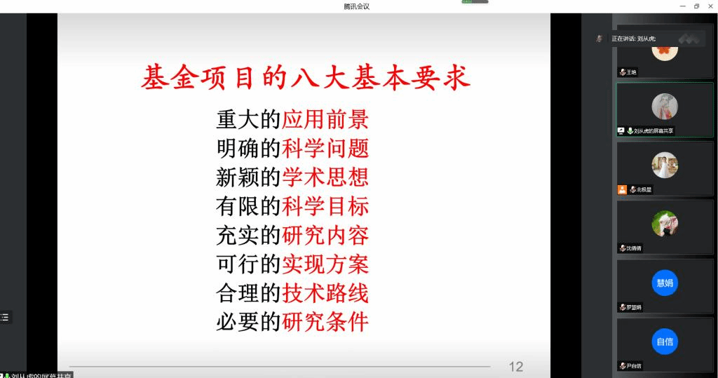 会上,科研副院长刘从虎就国家自然基金项目撰写与申报做了专题讲座。从基金项目申请漫谈、撰写思路、技巧三个方面进行了详细讲解。他不仅讲解了基金项目的基本要求、满足要求的本子特点,以及写本子的基本原则,还指出要想申请成功,就必须有一个好的策划。首先要花大量的精力去创新,再花大量的苦力去写本子,最终肯定能够写成功。