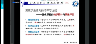 线上培训教师详细讲解了课程和教师层面如何落实面向产出的有关要求,介绍如何开展面向产出的课程大纲制定与课程目标评价工作,并分享面向产出的课程改革经验。通过本次学习,全体教师对专业认证的课程大纲制定与课程目标评价有了更详细的认知,为课程教学提供了好方法。