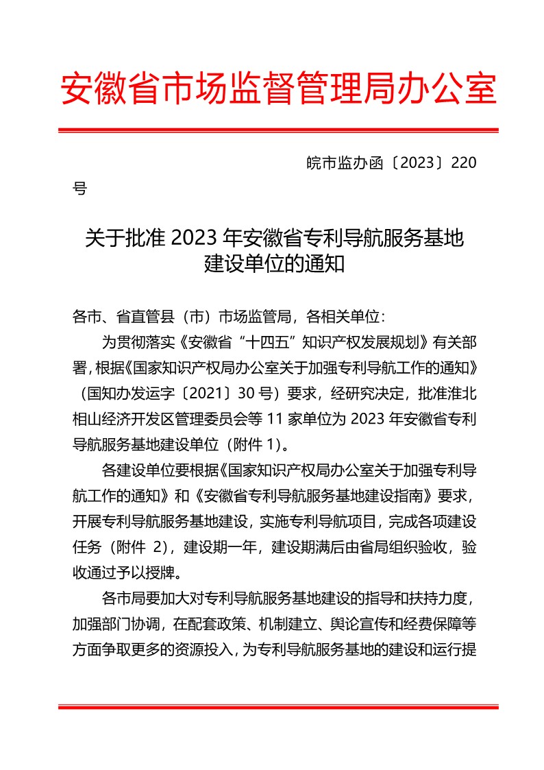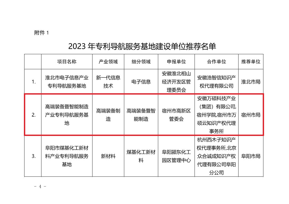 近日,安徽省市场监督管理局办公室印发《关于批准2023年安徽省专利导航服务基地建设单位的通知》(皖市监办函[2023]220号)文件,宿州学院机械与电子工程学院联合宿州市高新区管委会、安徽万硕科技产业(集团)有限公司共同申报的“高端装备暨智能制造产业专利导航服务基地”项目成功获批,标志着学院对外交流合作迈上了一个新台阶。