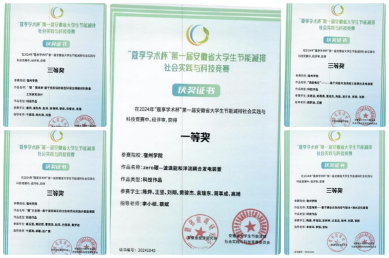 本次赛事共有来自全省32所高校的1199件作品参赛,经网络评审和竞赛委员会审议,147件作品进入决赛。在决赛阶段,经答辩讲解、实物展示、专家提问等环节,我校参赛作品《Zero碳—波浪能和洋流耦合发电装置》(项目组成员:陈烨、王坚;指导教师:李小标、蔡斌)获得科技作品类一等奖。