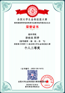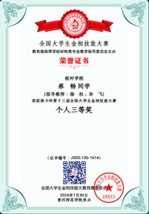 机械创新设计实验室积极组织学生参赛,经校赛选拔、省赛推荐,我校蔡畅、汪旭、孙世杰3名同学顺利进入国赛。同学们赛前精心准备,赛场“沉得住气、静得下心、下得去手”,经过样品预磨、试样抛光、浸蚀、显微镜观察操作等竞赛环节,展示了扎实的专业基础知识和规范的设备操作技能,创造了宿州学院参加此项大赛的最好成绩。