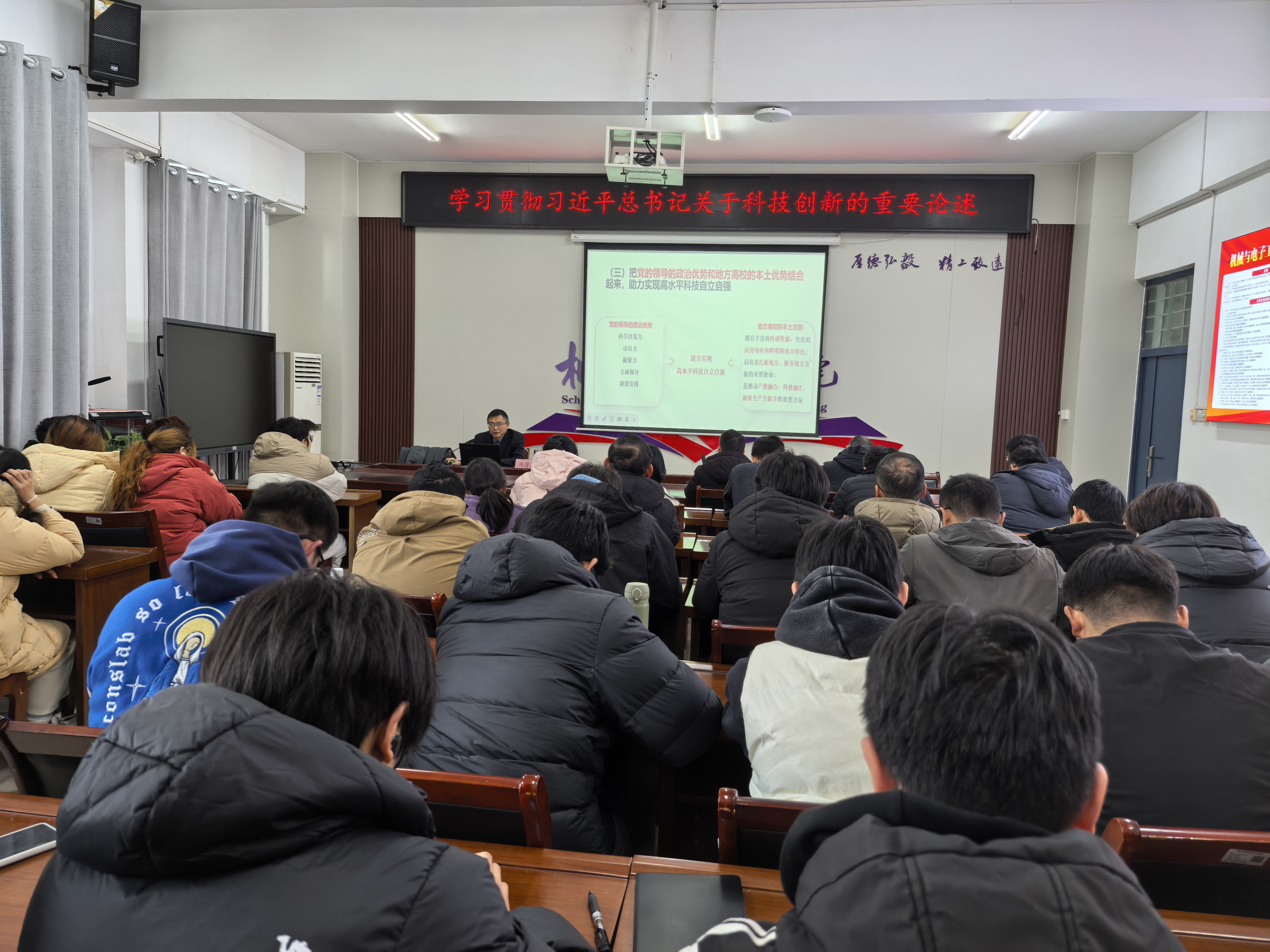为深入贯彻落实习近平总书记对学校思政课建设作出的重要指示精神,全面贯彻党的教育方针,更好落实立德树人根本任务,12月17日下午,副校长陈得宝教授走进机械与电子工程学院,围绕学习贯彻习近平总书记关于科技创新的重要论述,给与会师生讲授了一场主题鲜明、内容丰富、富有思想性、理论性、亲和力的思政课。机电学院班子成员、部分教师及2023级机械制造1班的同学现场聆听了课程。