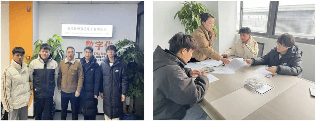 12月11日,机械与电子工程学院郭凯和王赛一行赴安徽优畅智造电子有限公司送2025届部分毕业生进厂参加实习,并开展“访企拓岗促就业”专项行动。