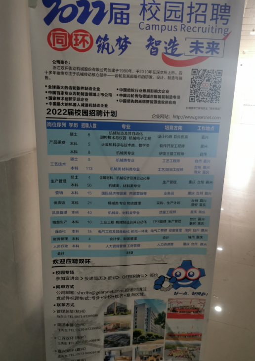 为更好搭建大学生就业平台,拓宽就业渠道,帮助毕业生了解用人单位需求,2021年10月18日下午4:30,在实训楼A303举办浙江双环传动机械股份有限公司专场招聘会。