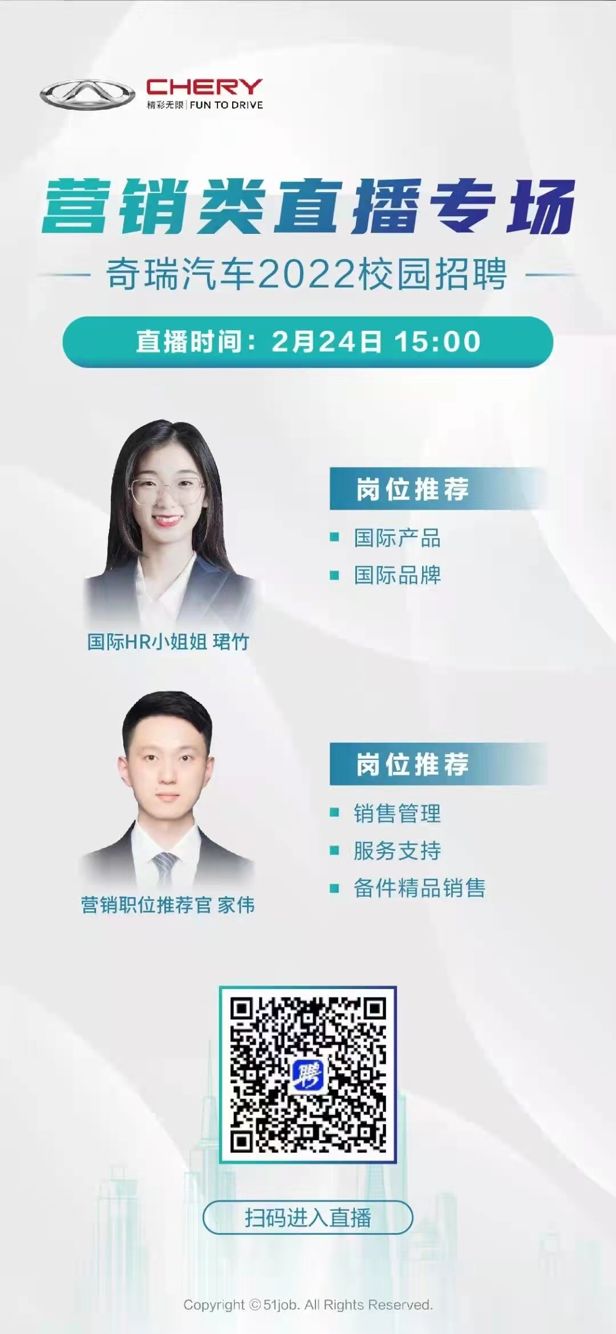 为更好地帮助学院毕业生顺利就业,切实做好学校2022届毕业生就业工作,学院与企业建立合作关系,以学生需求为导向,多措并举,筹措资源,力求实现企业与学生的精准对接。参会企业在充分掌握学生就业意向和期望的前提下,开展点对点的就业服务与指导工作,奇瑞集团2022年2月24日下午3:00于腾讯会议线上举办专场宣讲。