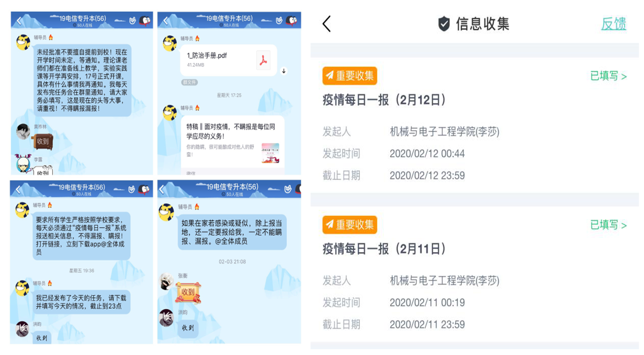 班级团支部“疫情每日一报”于2月8日启动,支部成员每日及时汇报健康情况,力争做到无发热无外出,健康平安,成为“疫情的防护者”和“健康的守护者”。除“疫情每日一报”以外,各团支部积极组织并通过网络平台召开疫情防控专项学习活动。各班级认真学习如何正确预防新型冠状病毒等知识。辅导员、班主任要求全体学生“要听从学校安排,保持联络畅通,不提前返校,每日积极汇报健康情况,不听谣不传谣,为打赢这场防疫战贡献力量。”
