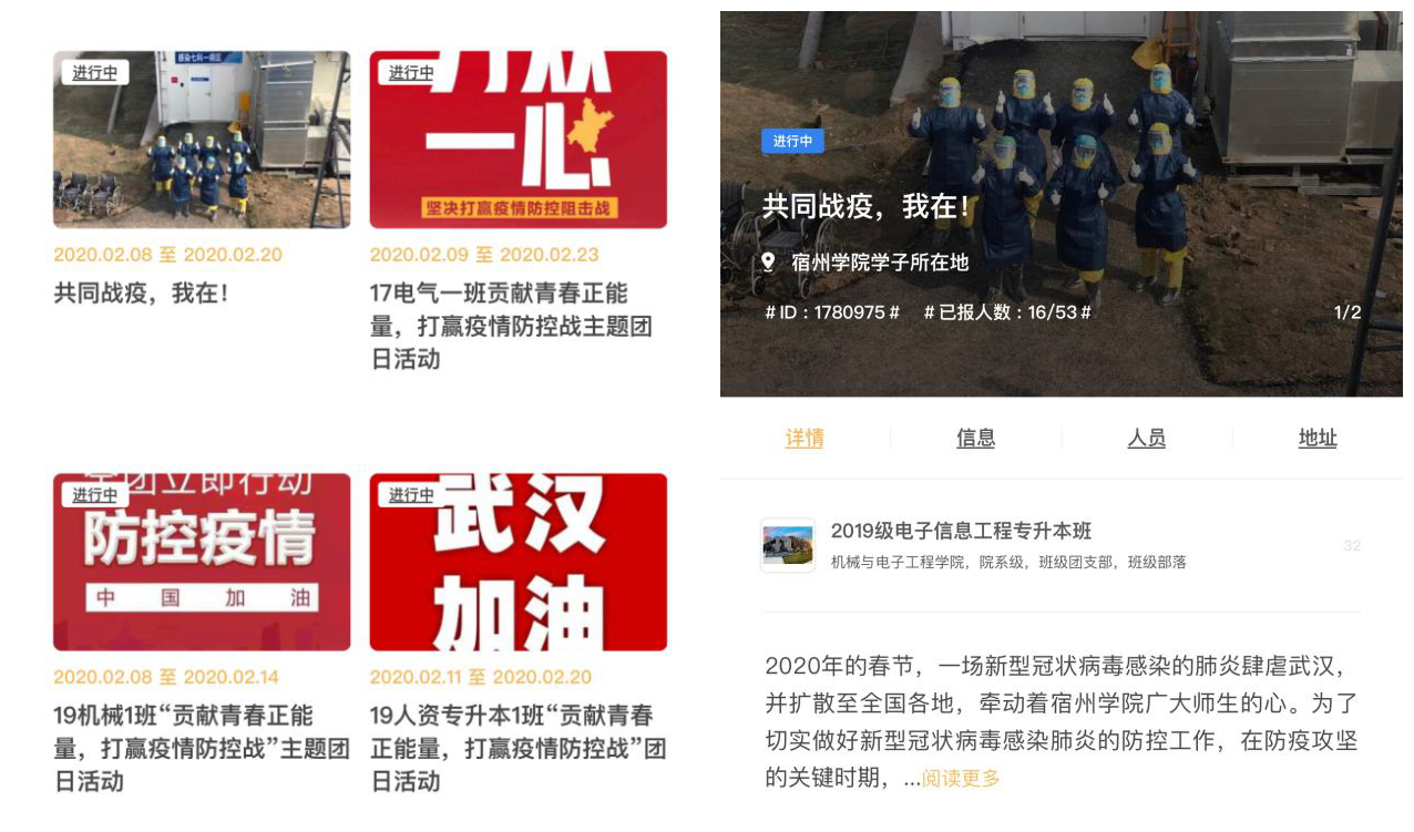 此次特别主题团日活动开展以来,机电学院团总支要求各班级结合自身实际,积极开展形式多样的主题团日活动,各班级积极响应,精心组织。充分发挥了基层团组织运用网络新媒体开展工作的创新精神,激发了广大青年团员打赢防控阻击战的强大精神力量。