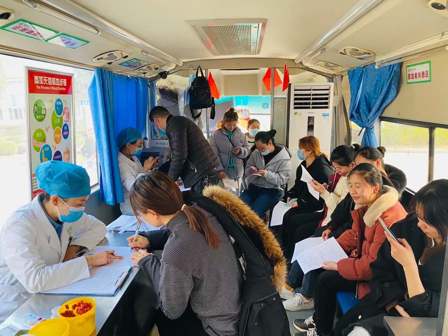 活动前期,志愿者以线上宣传、现场咨询等方式对无偿献血活动进行了宣传和动员。活动开始后,志愿者们组织献血同学有序排队,讲解注意事项,填写健康征询表和献血登记表后,依次进行健康征询与体检、血液检测,献血。“献出可以再生的血液,挽救不可重来的生命”。活动现场上,尽管天气寒冷,前来献血的学生依旧热情洋溢。多位志愿者在志愿服务的空闲时间里也加入到献血的队伍中。活动期间,马鞍山市红十字无偿献血志愿者协会的志愿者们到我校活动现场交流指导无偿献血志愿服务工作,并提出了宝贵意见和建议。