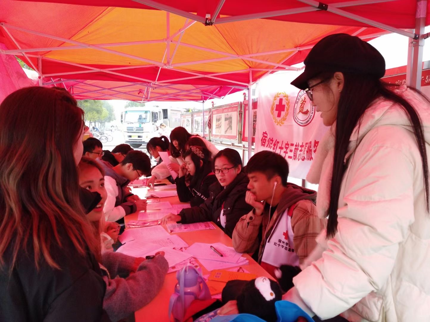 12月11日到13日,宿州学院红十字三献志愿服务队联合宿州市中心血站、宿州市红十字三献志愿服务队开展校园无偿献血和造血干细胞志愿捐献者招募活动。