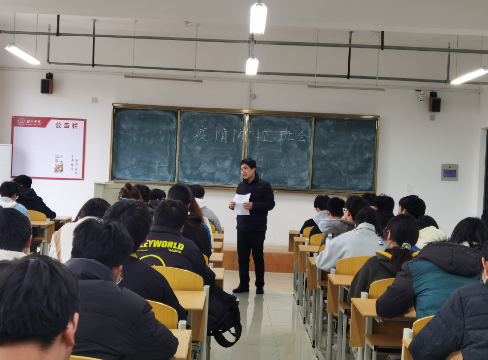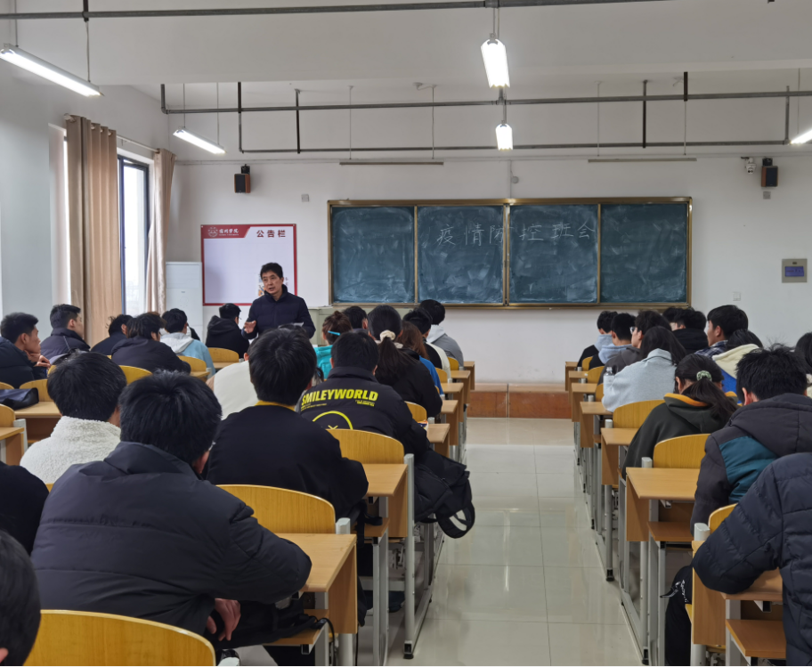 会上,房爱东书记传达了学校疫情防控工作推进会议精神,传达了《关于进一步从严从紧做好当前疫情防控工作的紧急通知》、宿州学院疫情防控学生安全管理十项规定等内容。他要求全班学生严格贯彻落实好学校疫情防控的工作部署,提高政治站位,克服麻痹思想,时刻绷紧疫情防控这根弦,严格落实校园相对封闭管理措施,坚持“日报告”“零报告”制度,减少快递收取,做好学生日常健康监测、安全排查和各类信息上报工作。