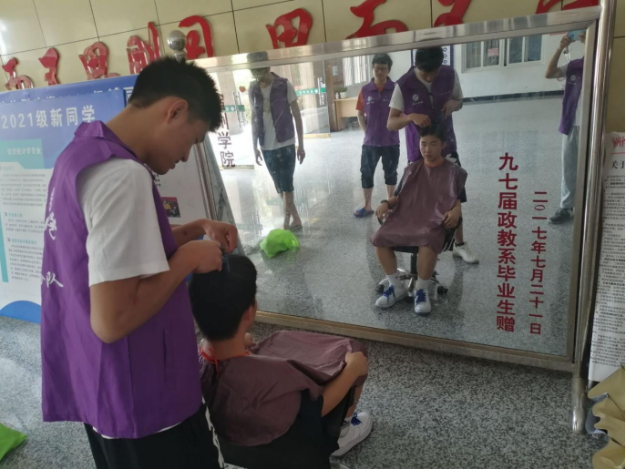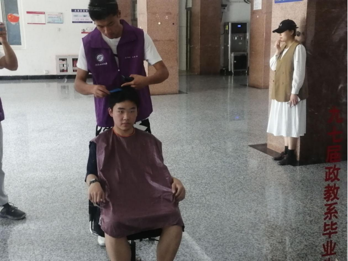 机电学院青年志愿者分队开展“志愿理发”活动为他们义务理发,解决了大家的“头”等大事,周末他们在教师楼一楼,一个反光镜、一把平剪、一把电推理发器、一张理发围布、青年志愿者在校园内为同学们开启了一个移动式“理发店”,每每帮助一个同学他们脸上都会洋溢着欣慰的笑容,尽显帮助同学的快乐。