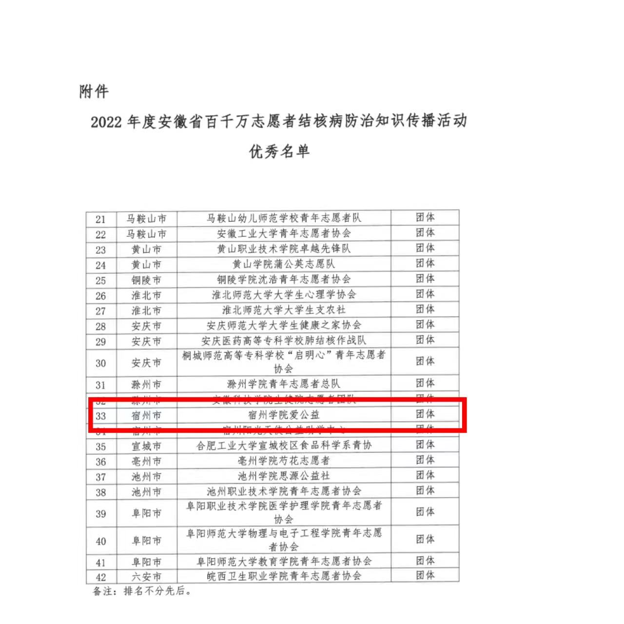近日,2022年度安徽省百千万志愿者结核病防治知识传播活动获奖名单公布,我校爱公益志愿者小队获得“优秀志愿者团体”荣誉称号,并荣获大学生志愿者团体培育计划二等资助。