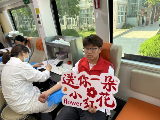 象征着奉献和爱心的小红花,传递着温暖和感动。参加献血的不仅有老师、学生,还有工作人员。第一次参加献血的同学王苏徽分享了自己的体会:“参加献血活动是一次意义非凡的壮举!不仅可以为社会奉献自己的一份爱心,让那些病人可以得到救助,使他们的生命延续!还有助于我们的身心健康,促进我们血液的生成,使我们的爱心传递下去。如果人人都献出一点爱,世界将会变成美好的明天!”