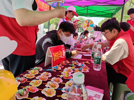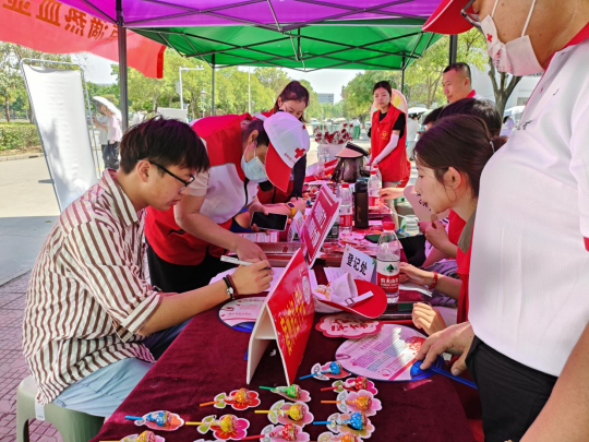 活动中,志愿者进宿舍、食堂、田径场分发宣传手册,积极宣传无偿献血和造血干细胞捐献知识,活动现场,设置了“赠送小红花”、“套住时光圈”等游戏环节,同学们通过参加知识问答等活动获得精美纪念品如:扇子、小红花、雨伞等。志愿者组织献血同学有序排队,讲解介绍献血流程和要求,告知注意事项,指导填写健康征询表和献血登记表,然后依次进行健康征询与体检、血液检测、献血。