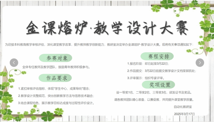 为迎接本科教育教学审核评估,深化课堂教学改革,提升教师教学创新能力,3月26日下午,自动化教研室启动"金课熔炉”磨课阶段,活动聚焦核心专业课程创新,通过"实战化说课+同行问诊"形式,对四门课程展开精细化打磨。