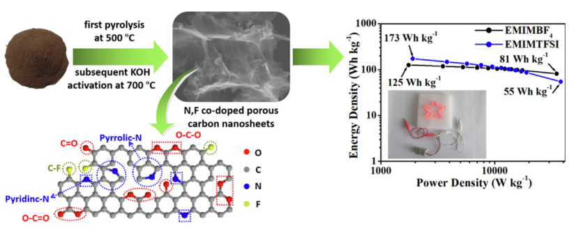 近日,我院自旋电子与纳米材料重点实验室、光电信息材料与新能源器件省级科研创新团队-朱光教授课题组在国际碳材料顶级期刊《Journal of Colloid and Interface Science》发表新型储能器件相关学术论文(Journal of Colloid and Interface Science 616 (2022) 413-421:DOI:org/10.1016/j.jcis.2022.02.087)。文章标题为“Waste-converted nitrogen and fluorine co-doped porous carbon nanosheets for high performance supercapacitor with ionic liquid electrolyte”,陈崇博士为第一作者、团队负责人朱光教授为该论文的通讯作者。