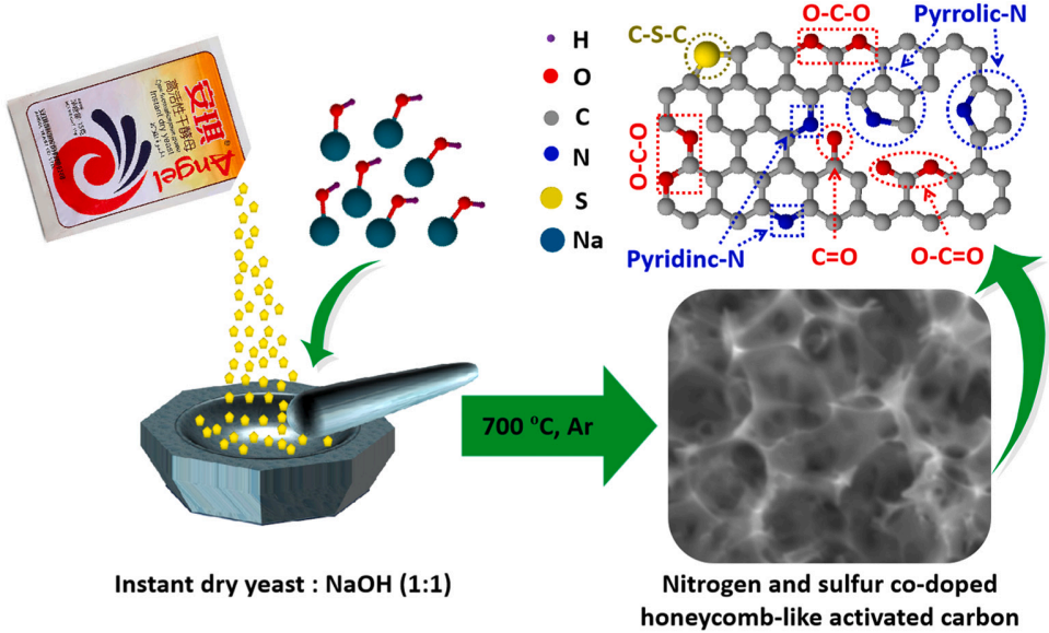 Diamond and Related Materials(影响因子:3.806)是材料科学类知名期刊。文章标题为“One-step production of N, S co-doped honeycomb-like activated carbon from instant dry yeast for high gravimetric and volumetric performance supercapacitors” (DOI: 10.1016/j.diamond.2022.109165)。联合培养研究生邵甲灿为第一作者,朱光教授和陈崇博士为该论文的共同通讯作者。该文章介绍了氮硫共掺杂蜂窝状活性炭电极材料的合成及其在超级电容器中的应用,该研究是以活性干酵母为碳前驱体通过炭化活化一步法制备出具有高比表面积和开孔结构的碳材料。研究成果为氮硫共掺杂蜂窝状多孔碳的制备提供了新的方法和思路,具有重要的学术和应用价值。