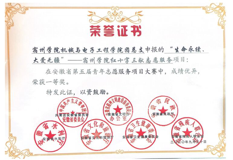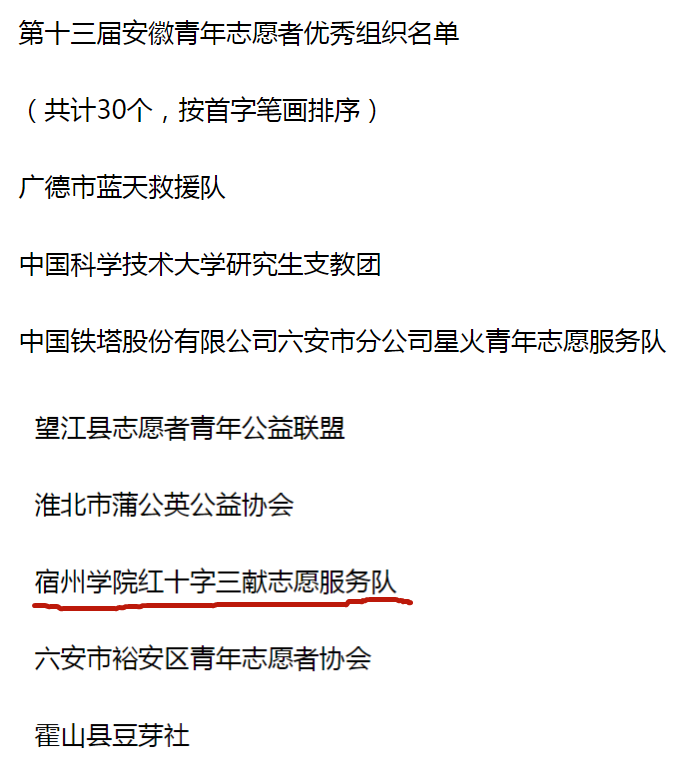 近日,第十三届安徽青年志愿者优秀个人、组织嘉许名单公布,宿州学院红十字三献志愿服务队获评优秀组织。