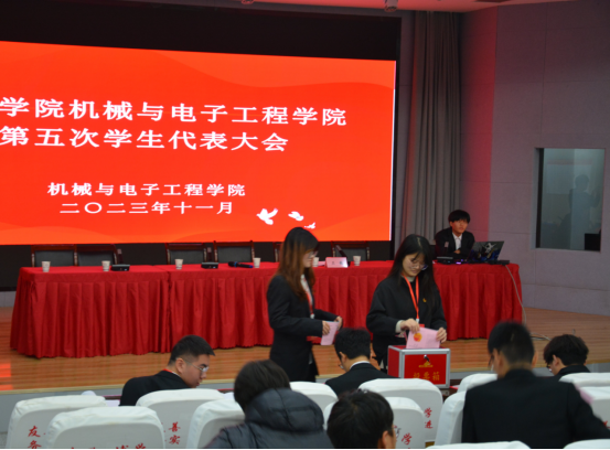 2023年11月15日中午12点30分,机械与电子工程学院第五次学生代表大会在工科楼招聘大厅胜利召开,机电学院党委书记杨杰、院长林永、党委副书记房爱东、教学副院长王桂英、科研副院长刘从虎以及43名学生代表出席会议,大会由分团委书记王巍主持。