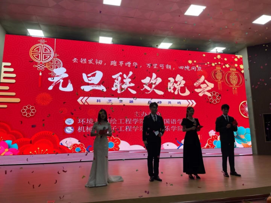12月27日,“科艺交融 音律共鸣”四院同庆元旦暨迎新晚会在大学生活动中心隆重举办。本次晚会由音乐学院、环境与测绘工程学院、外国语学院、机械与电子工程学院联合举办。机械与电子工程学院、音乐学院、环境与测绘工程学院、外国语学院党政领导班子、全体专兼职辅导员,学院教师和各年级学生代表近600名师生欢聚一堂,庆祝元旦,喜迎新年。
