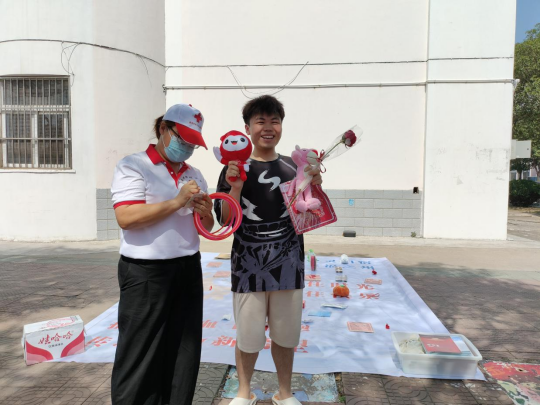 活动中,志愿者进宿舍、食堂、田径场分发宣传手册,积极宣传无偿献血和造血干细胞捐献知识,活动现场,设置了“赠送小红花”、“套住时光圈”等游戏环节,同学们通过参加知识问答等活动获得精美纪念品如:扇子、小红花、雨伞等。志愿者组织献血同学有序排队,讲解介绍献血流程和要求,告知注意事项,指导填写健康征询表和献血登记表,然后依次进行健康征询与体检、血液检测、献血。