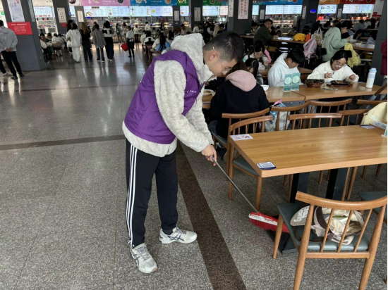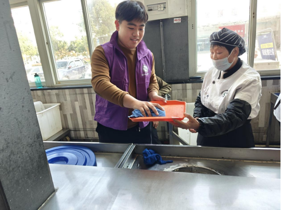 热心的志愿者们齐聚在食堂,身着统一的工作服,他们有的拿着扫把,有的拿着抹布。大家准备充分,分成小组有序分工合作,进行食堂各个区域的清洁,每个人都在为改善食堂环境贡献自己的一份力量。