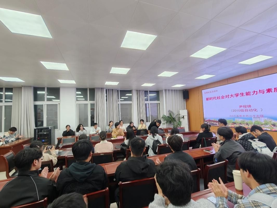 2025年10月27日晚上6点,机电学院邀请我院2010届自动化专业优秀毕业生尹程锦作“新时代大学生能力与素质提升“专题讲座,本次讲座由学院党委副书记、纪委书记王艳主持,分团委学生会全体学生干部参与。