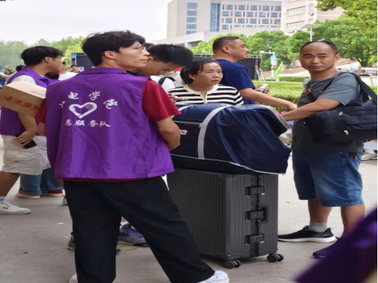 在开学第一天,学院组织了大量志愿者,他们身穿志愿者马甲,站在校门入口处热情迎接每一位新生的到来。志愿者们不仅帮助新生搬运行李,还耐心地为他们讲解报道流程,确保每位新生都能快速、高效地完成入学手续。尽管一天的工作非常辛苦,但志愿者们以积极饱满的热情完成了任务,展现了机电学院学生的风采和奉献精神。