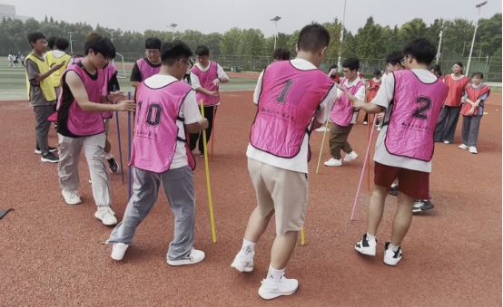 活动分为五组进行,每组分别进行“无敌风火轮”、“同心击鼓”、“珠行万里”、“不倒森林”等四个项目。活动中,同学们齐心协力、配合默契、互相鼓励,共同完成了项目挑战。通过体验式参与,增强学生之间的彼此信任,在欢快的氛围中减轻了心理压力、放松了身心、锻炼了团队协作能力。