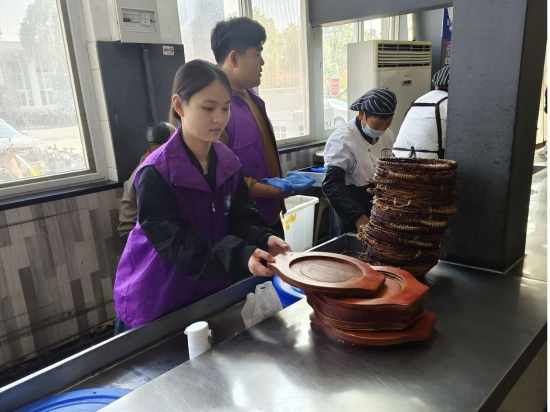 热心的志愿者们齐聚在食堂,身着统一的工作服,他们有的拿着扫把,有的拿着抹布。大家准备充分,分成小组有序分工合作,进行食堂各个区域的清洁,每个人都在为改善食堂环境贡献自己的一份力量。