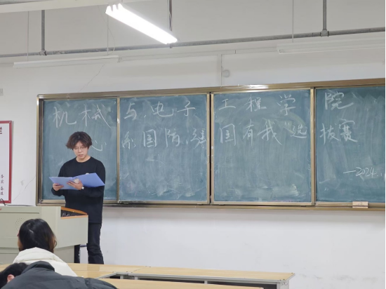 2024 年 11 月 29 日晚,一场以“心系国防,强国有我”为主题的演讲选拔赛在机械与电子工程学院准时拉开序幕。当晚七点,来自不同专业的选手们齐聚一堂,用他们的激情和智慧,展开了一场关于国防意识的精彩演讲。