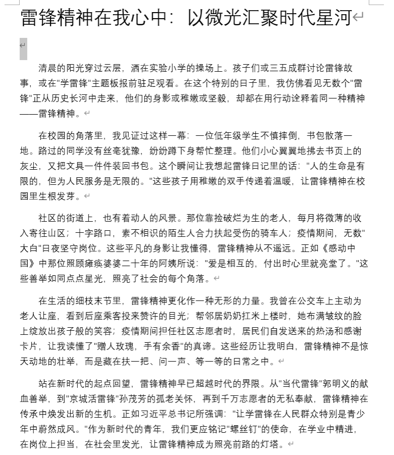 此次“雷锋精神在我心中”主题征文活动不仅是一次文字创作的盛宴,更是一场精神的洗礼与传承。通过青年学子的笔触,雷锋精神被赋予新时代的青春注脚,展现出历久弥新的生命力。未来,机械与电子工程学院将持续深化雷锋精神主题教育,引导青年学子以行动践行“螺丝钉”的奉献情怀,用专业技术赋能社会服务,在科技报国、技能强国的征程中书写新时代的雷锋故事。