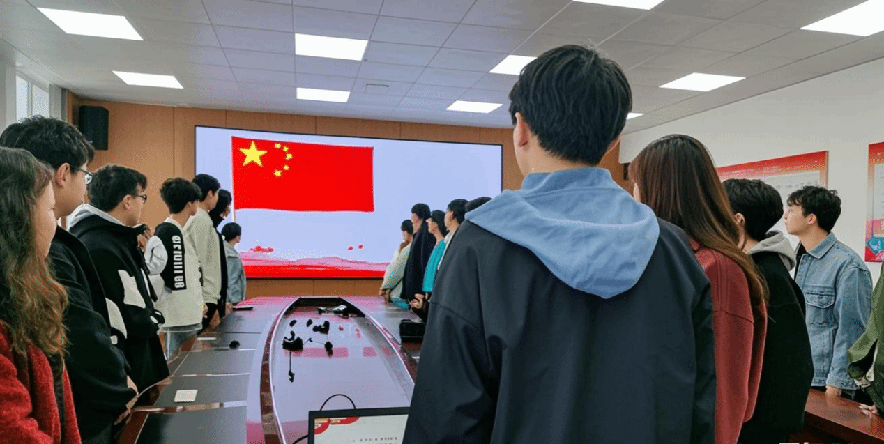 会议接近尾声,全体与会人员庄严肃立,面向鲜艳的五星红旗,齐声高唱国歌。激昂的旋律回荡在会议室中,入团积极分子以饱满的热情、坚定的神情唱出对祖国的热爱与敬意,歌声中满是对成为共青团员、为国家和社会贡献力量的向往与决心。